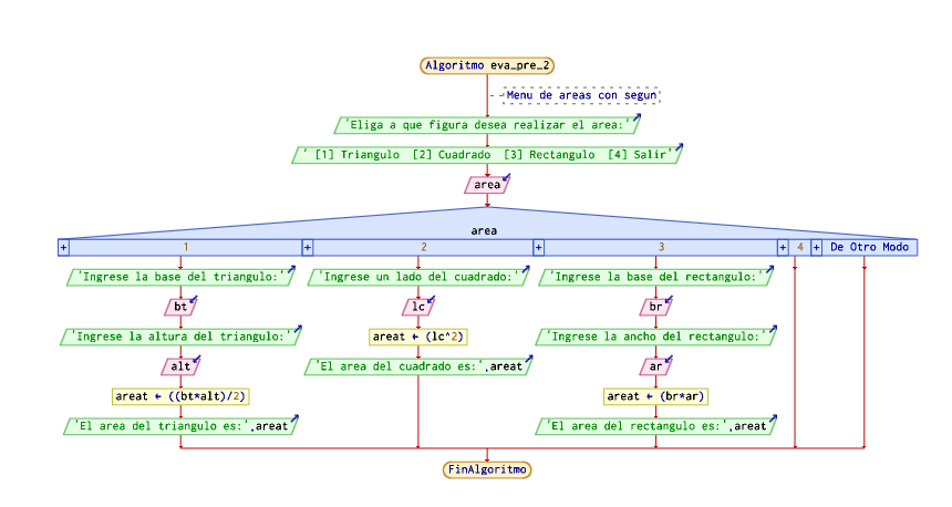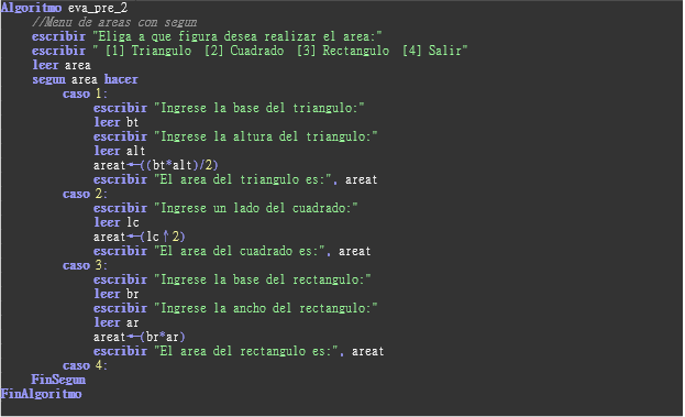 El código nos muestra que mediante la estructura selectiva SEGUN, tendremos la opción de seleccionar a que figura le queremos calcular el área.