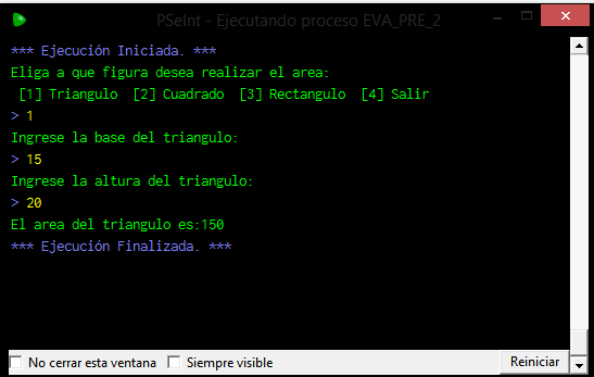 [1] Triangulo→ Si seleccionamos 1 entonces el programa nos pedirá que ingresemos los datos del triangulo para calcular su área.