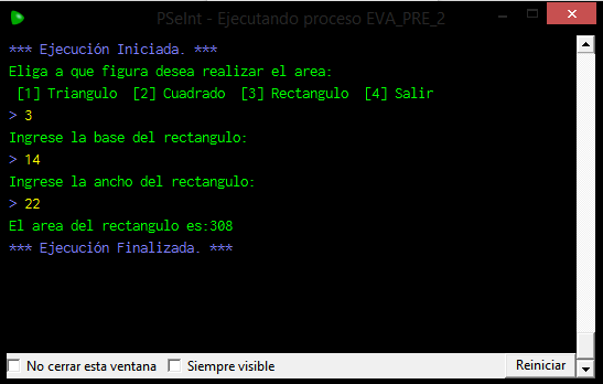 [3]Rectángulo→ Si seleccionamos 3 entonces el programa nos pedirá que ingresemos los datos del rectángulo para calcular su área.