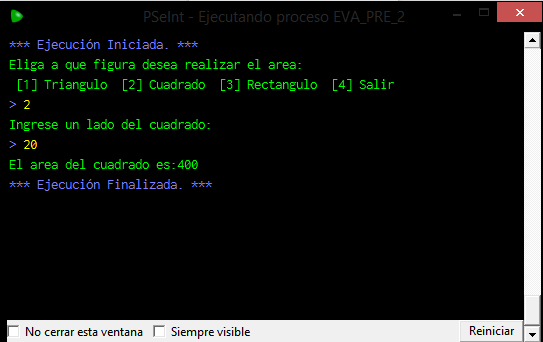 [2] Cuadrado→ Si seleccionamos 2 entonces el programa nos pedirá que ingresemos los datos del cuadrado para calcular su área.