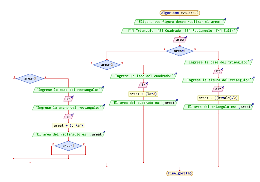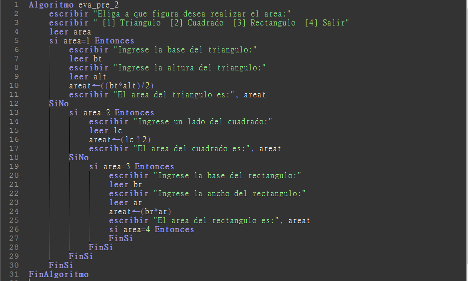 El código nos muestra que mediante la estructura selectiva Si-Entonces, tendremos la opción de seleccionar a que figura le queremos calcular el área.